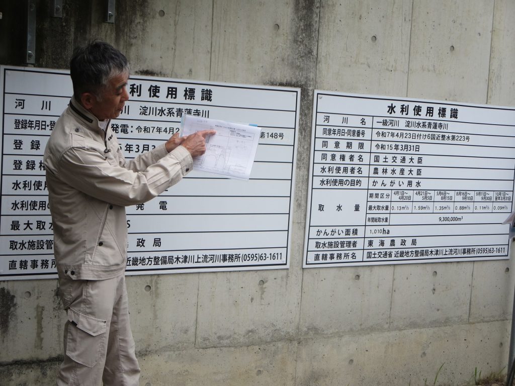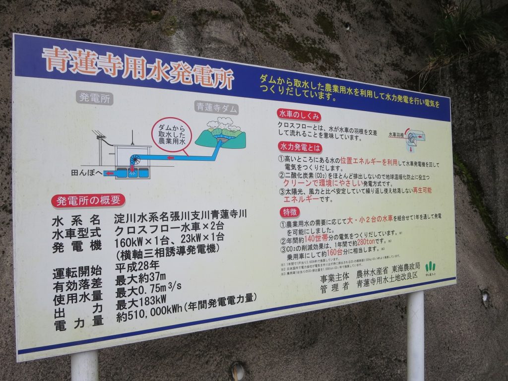 2016年運転開始の青蓮寺用水発電所。名張市内の青蓮寺ダムから取水する農業用水を活用し、最大出力183kwで一般家庭の約140世帯分に相当する約510,000kwh/年の発電可能電力量との計画概要です。
