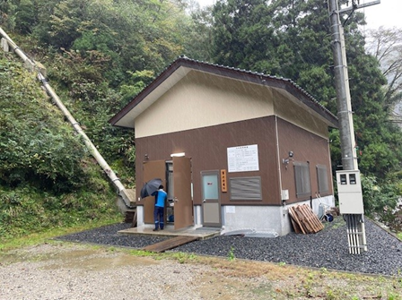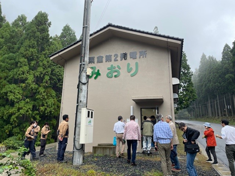2日目はあいにくの小雨模様、8時半に宿舎のコムニタを出て、池田町役場で本日参加組と合流し北陸電力の小水力発電所の持越(もちこし)発電所、白粟(しらわ)発電所に向かう。